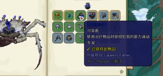 流光混合体是菌生蟹在专家模式中掉落的一个饰品,它的效果是在使用各种治疗性物品时获得十秒钟的能力涌动,增加百分之十的伤害和百分之二十的近战攻击速度。触发特效时头和瓶子都会发光,是肉前较为稀有的增伤饰品,配合冷却短的恢复药水效果很好。
