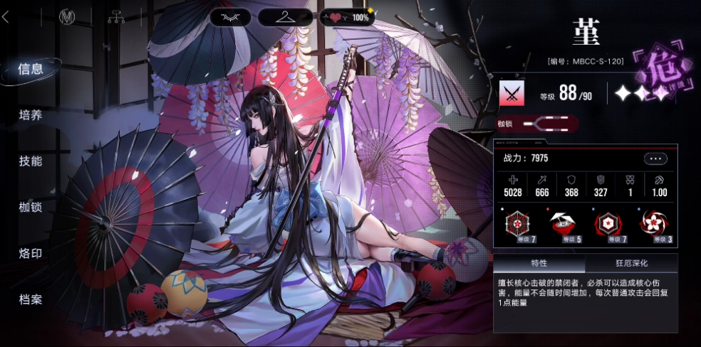 堇的特性是攻击能增加能量,对比常规的按时间回能,这个充能方式有较大的局限性,需要一直有攻击目标才能保持稳定的回能,但高攻速和多段攻击能加速充能,可以说是有利有弊。堇的狂厄深化是敌人每携带一种生命流逝能提高百分之六的伤害,该效果只有在流血队中才能发挥出最大价值。普攻倍率偏低,没什么特殊机制,必杀是一乘四的范围破核,破两核是这个技能最大的作用,升满后的倍率一般,只有百分之九百,必杀附带一次位移效果,跟雷比尼斯相似,能让堇在位移破核的同时不浪费移动次数。