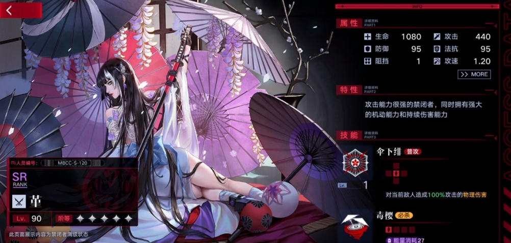 必杀能量消耗为三十一点,对于一个破核手来说还是比较高的,就算有四枷的情况下也需要二十八点耗能,在开局就有攻击目标的情况下,不带任何充能套的堇也需要最少三十秒来打满能量。由于必杀充能只有一层,堇使用必杀也要更加谨慎,因此对于破核手来说堇是无法满足短时间内高频率破核的,对比澈和女仆还是有一定差距。被动一狂樱是每隔十六秒堇会对前方两格内所有敌方目标发动六次快速刺击,每次刺击造成自身攻击百分之三十多的物伤,这个特效还是比较明显的,但伤害倍率只有百分之两百一十多,堇造成流血效果的倍率升满为百分之八十一,持续八秒钟。
