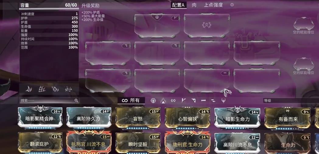 在装备的强化界面里,在左上角有该件装备的卡片总容量,下方则会有许多可装备的卡牌。每装备一张卡牌就要消耗卡片右上角对应的容量,例如装上这张生命力就要消耗掉两点容量。较为特别的是战甲的光环卡与近战武器的姿态卡,装上后就能直接增加振幅晶体容量的,有些装备的卡位里自带有极性,表现为犬牙或者横线的模样。