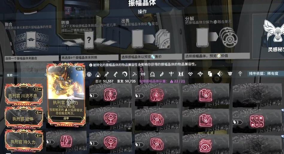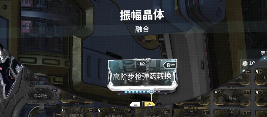 振幅晶体是最为重要的卡牌模组,可以镶嵌在武器、战甲、反重力曲翼,甚至间谍任务里用来破译密码的灭骸之刃上。玩家可以将它们都仅仅理解为一个载体,必须要装备上合适的振幅晶体才能发挥出作用。如果发现自己与其他人都用的是相同武器与战甲,却打不出相当的效果,就需要怀疑是不是配卡出现了问题。在飞船里面打开装备来选择晶体,此时便能看到我们已经拥有的所有卡片,按照稀有度划分,可以分为瑕疵卡、铜、银、金、高阶卡与特殊的紫卡。