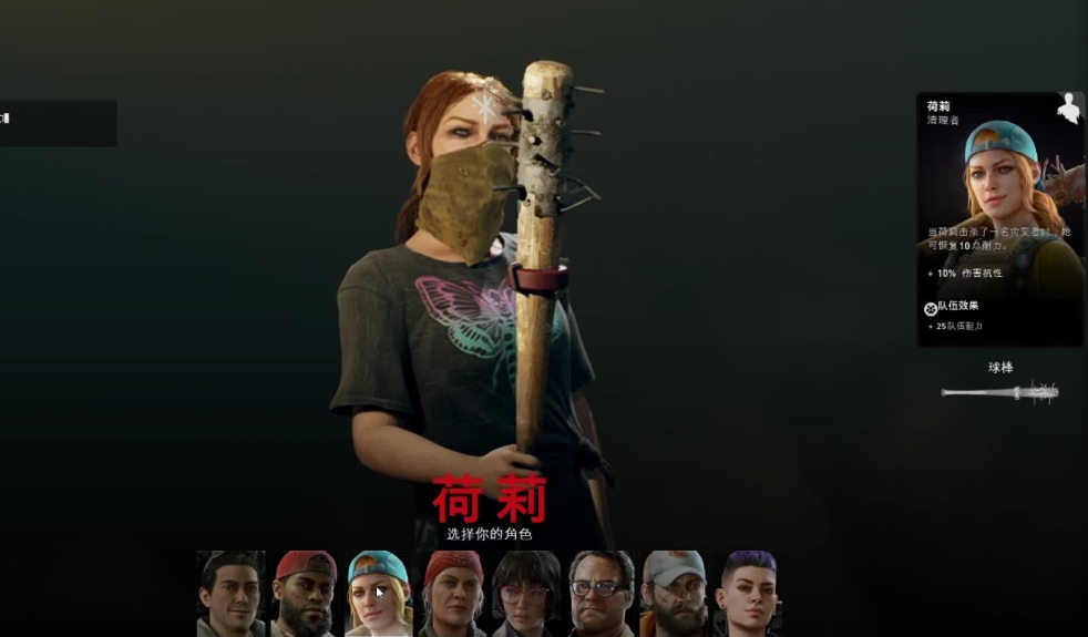 荷莉自带击杀回血和耐力增加,团队天赋是增加队伍的伤害抗性,自带武器为870单喷和棒球棍,她可以说是新手必玩角色,自身击杀回血和耐力增加的机制注定她要玩近战位。随着卡牌的配置,荷莉甚至能利用散弹枪增加自己的生存能力,因此也有玩家会用她来玩枪械流派。普通灾变者非常怕近战,除了后期难度有几种穿盔甲和重装的,敲一两下就会死亡,十分契合荷莉的击杀回血天赋。
