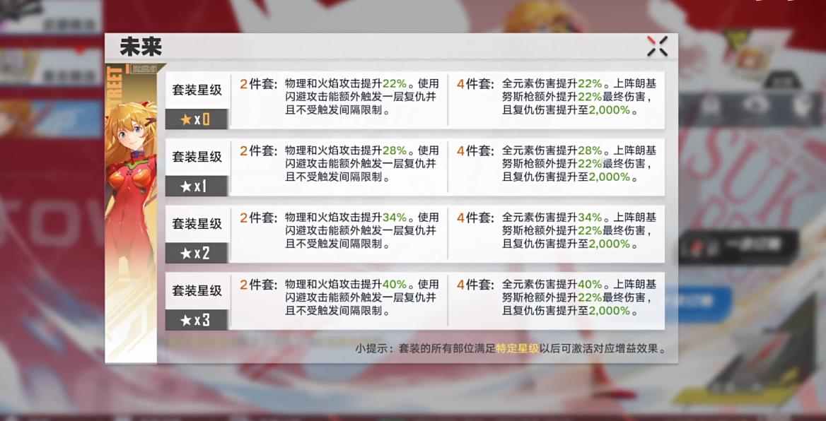 机制较为全面,还能在坚毅玩法的队伍里有较为长久的使用周期。意志最为适合的选择是二号机,二件套是使用闪避攻击时可额外触发一次复仇效果,比较适配烟渺闪避攻击并触发灼刃。四件套绑定专属武器才能使用,上阵时会提升百分之二十二最终伤害,并提高复仇倍率。由于明日香属于后台输出角色,以前的意志并没有特别合适的,普池里只有乌米意志可以过渡使用。