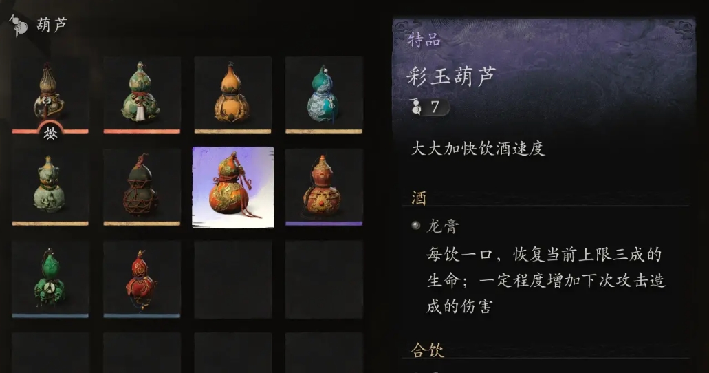 乾坤彩葫芦作为一个神珍葫芦最大的特点就是增伤非常夸张,饮尽后的三十秒内能直接获得百分之三十的增伤效果,这个增伤数值就算在全部技能中也算很高了,夜叉套的增伤也就百分之二十五,所以这个葫芦也是一个重要的增伤手段。它的缺点在于容量比较小,最多只能喝六口。彩玉葫芦的被动在所有葫芦中是最特殊的,它能提高玩家的饮酒速度,连续饮酒时能明显感受到饮酒速度的提升,这也是唯一一个提高饮酒速度的葫芦。