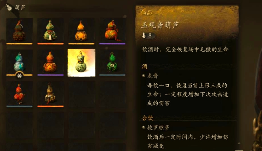 上清宝葫芦由初始葫芦逐步强化而来,在第五章中就能变为神珍品质的上清宝葫芦,这个葫芦的容量比较大,最多能喝十口。五鬼和妙仙葫芦都有一个共同的缺点,就是饮酒时所有酒类的回复效果减少一半,不过持续效果并不会减半,可以搭配干和烧来使用,回复效果减半换来的属性也算实用,两种葫芦饮酒后的二十秒内都会提高攻击力,五鬼葫芦是提高十五点,妙仙葫芦是提升二十点。