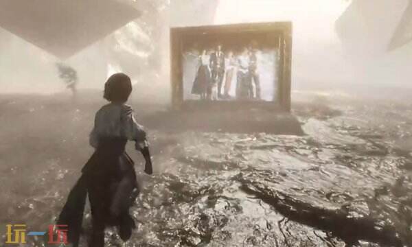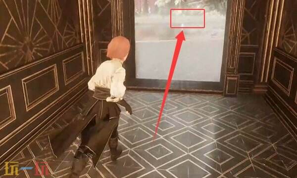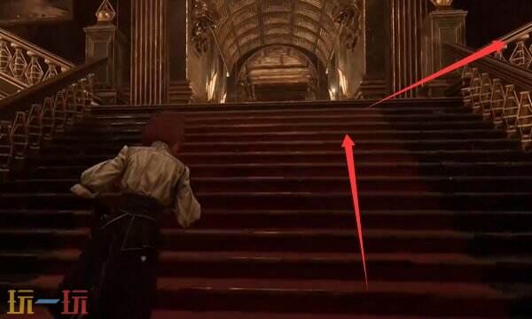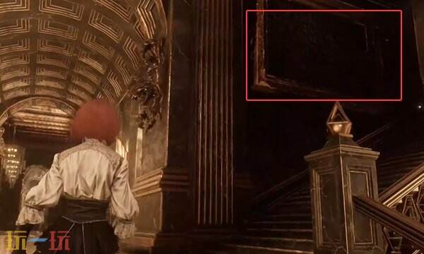 不用上去,就在楼梯中层这里有个空白的相框,与之交互将家族肖像镶嵌上去,开启中间的门。