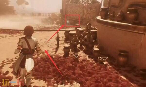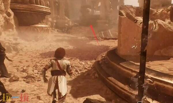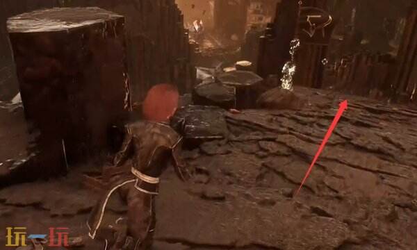 依次钩过两个钩索到下面的平台后,继续顺着箭头的方向走,到尽头。