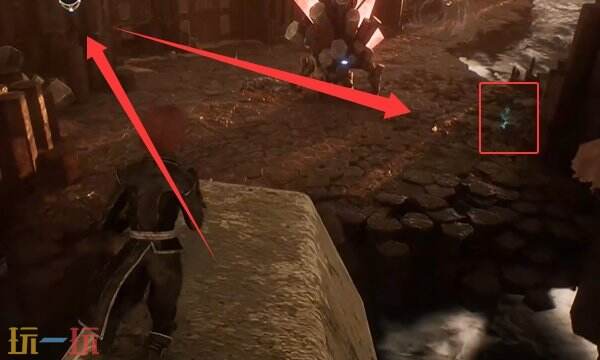利用钩索到下面的平台去,就在右边墙角下有我们寻找的绿色闪光点。