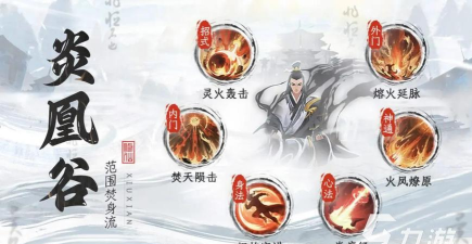 炎凰谷宗门的战斗体系是通过叠加焚身效果和引爆焚身伤害。外门功法:【熔火延脉】造成持续伤害并且会给敌人叠加焚身的效果;内门功法:【焚天陨击】从天而降火陨石,对敌人造成毁灭性的打击,被击中的敌人如果同时带有焚身效果会陷入眩晕;招式功法:【灵火轰击】灵火凝聚成火球,对敌人进行轰击,造成伤害的同时对敌人叠加焚身效果;身法功法【炽焰突进】:化身一团火焰向前突进,突进时会同时造成引爆,瞬间能打很高的爆发伤害;神通功法:【火凤燎原】召唤一只火凤凰,对大范围的敌人造成焚身伤害;心法功法【炎痕经】:提升自身的会心率和会心伤害,增加神通功法的梵天伤害。