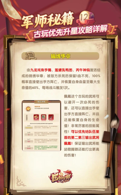 锦绣华章由莲塘乳鸭图、九龙戏珠手镯和丙午神钩激活而成,效果为被敌方杀死时能保留1滴血不死,100%让出手方死亡,并且回复自身60%最大生命值的血量,每场战斗可触发一次,这个强力免死非常推荐和输出携带。