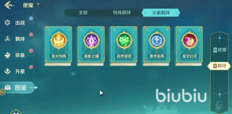 第一个角度是玩家们可以从自己选择的职业上入手,也就是说考虑下元素羁绊加成。当玩家选择2个相同元素的使魔上阵后,可以在对战时额外能再多一个元素羁绊技能。比如说光元素的话,可以释放一个【圣光列阵】技能,这个技能效果是可以在周围制造一个圣光之矛的范围,能对范围内的目标造成光元素伤害,在命中后还能让自己获得一个可以减伤的护盾;暗元素的话是【暗影之瞳】,通过召唤暗影生物来对目标区域的目标进行诅咒,被诅咒的目标会有一个沉默+减速的效果,在被诅咒标记时间内还会持续受到暗元素伤害。像这样的使魔元素羁绊有5种,玩家可以结合自己选择的职业来选择。