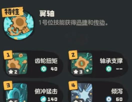 帕帕斯卡在实战中的战术定位清晰:依托九种细别相性的抗性覆盖实现稳定站场,并通过特性“翼轴”强化1号位技能——该特性同时赋予迅捷与“传动”效果。“传动”指回合结束时,当前使用的技能将自动顺延至下一个技能栏位,从而动态改变技能序列。这一机制要求玩家熟记初始排布并预判后续位置变化。此外,“轴承支撑”作为关键辅助技能,置于2号位时最为稳妥:释放后可使相邻技能消耗降低2点,有效优化技能轮转节奏与资源分配效率。
