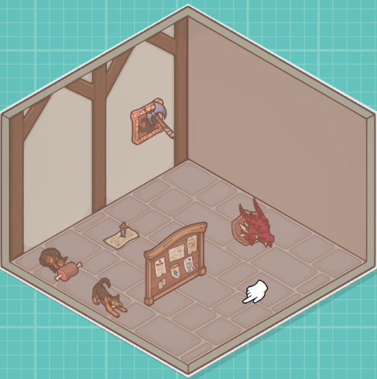 《造景贴纸:治愈小角落》里一共有八个关卡,每一关都会有三个成就解锁,当我们通过第六关的时候会有快乐修勾,招募板子,猎龙人三个成就,需要我们把狗和肉放在一起,把向下插的匕首和地图放在一起,把劈进墙里的斧子和有龙影的挂画放在一起。