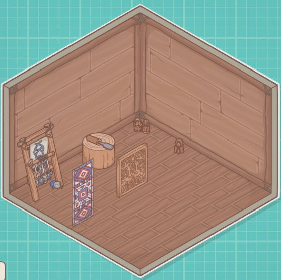 《造景贴纸:治愈小角落》里一共有八个关卡,每一关都会有三个成就解锁,当我们通过第四关的时候会有维京壁毯,雕刻墙壁,幸福一家三个成就,需要我们把毛线球放到织布机旁,把平凿放在原木上,把两个木制小偶放在一起。