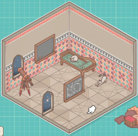 《造景贴纸:治愈小角落》里一共有八个关卡,每一关都会有三个成就解锁,当我们通过第二关的时候会有观星者,黑白搭配,大懒腰三个成就,需要我们把望远镜和窗户放一起,把黑板和粉笔放一起,把猫放在绿色坐榻上