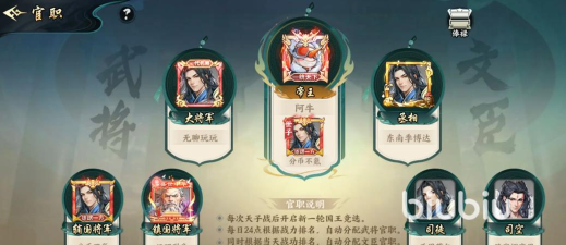 根据小编了解到的信息,比较不错的是他的武将官职是能根据玩家的战斗力排名每日结算的,高战力者能担任大将军、辅国将军等职,而文臣官职方面则是根据当日累计战功分配,如丞相、司空、司徒等都是,主要是侧重战略运营方面的能力,每日会在24点系统自动评定,竞争方面还是很激烈的,所以玩家想要有个较高的官职,那么自己得保持活跃。