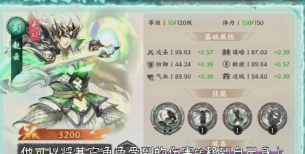 赵云带有破甲效果,他的怒气技会对前面5列所有敌方造成伤害,并附加25%破甲,他的觉醒技在激活后,会让打出的怒气技飞出屏幕后重新飞回,对范围内敌人打来一次55%的二次伤害,他的被动能在场上有敌方主将阵亡时,回复400怒气并在8秒内提升攻击力。