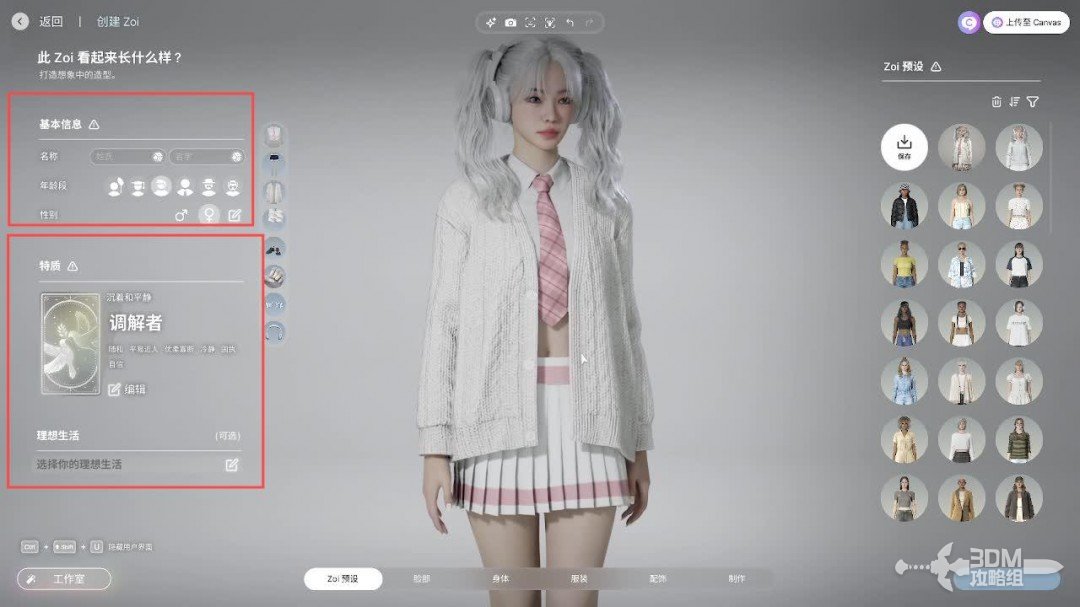 左边可以选择zoi的年龄、性别和性格。