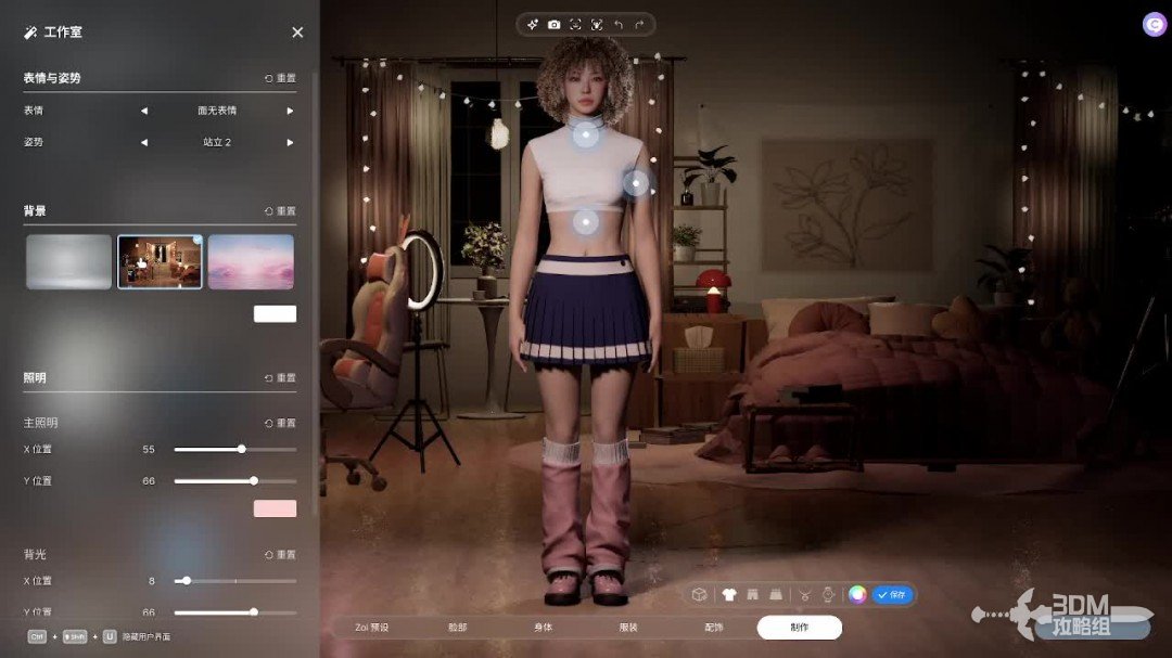 在游戏的左下角点击工作室,可以调整捏人界面的的背景灯光人物表情和姿势,从而可以让人物在局内的各种打光下还能保证面部不崩坏。