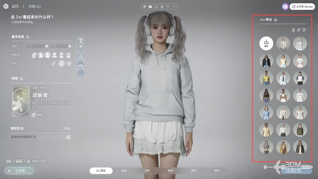 一进去在右边可以选择预设,自己捏出来的zoi也可以上传保存在右边。