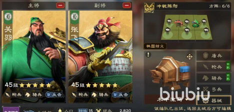 以桃园阵容为例,技能配置需围绕“反击流”与“减伤续航”双核心展开。主将关羽推荐携带【霸王反戈】与【八师破金】;刘备必带【坚阵合一】——该技能提供高额减伤与群体护盾,是开荒期生存能力的关键保障;张飞则选用【新州军】(激活全队反击机制)搭配【列阵御敌】,进一步强化承伤与反打能力。整体思路并非追求爆发输出,而是通过延长战斗时间、降低战损来实现稳定通关。