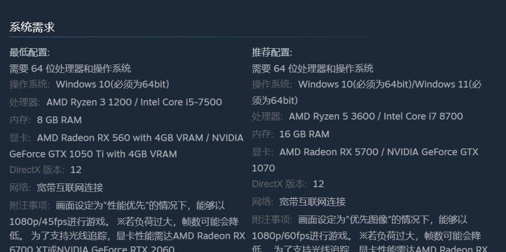 至于显卡需要GTX1070以上,这个指的是不开光线追踪以1080p分辨率运行的要求,如果你是2K屏或者更高规格的显示器,恐怕要求需要增加,这种情况下可能需要RTX2070甚至3060或更先进的型号, 但如果你是拥有4090那种旗舰显卡的玩家,那么基本上可以随便来了,也不用在意太多细节,也不存在有带不动的画面。其余方面DirectX12版本与需要互联网下载游戏,都是最基本的要求,所以没必要特别在意。
