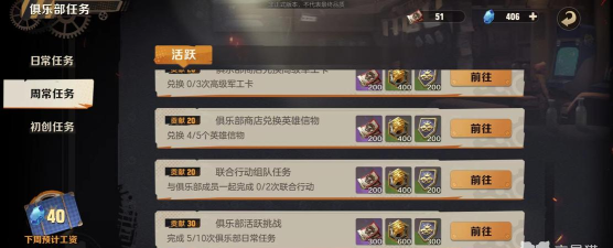 俱乐部的周常任务有也是有4个,第一任务是在俱乐部商店兑换三次高级军工卡,军工卡兑换需要200点俱乐部点券,这个数量并不少,需要大家积极参与俱乐部活动才能获得足够的俱乐部点数;第二个在俱乐部商店兑换5点英雄信物,英雄信物需要的点数也是200点一个,所以要完成周常任务需要的俱乐部点数还算比较多;第三个是与俱乐部成员一起两次联合行动,这个比较简单,直接找个成员和我们组队就好了;第四个任务是完成10次俱乐部日常任务,10次日常任务,大概需要完成2次所有的日常任务就好了。每周完成所有的周常任务可以获得60点的个人贡献值。