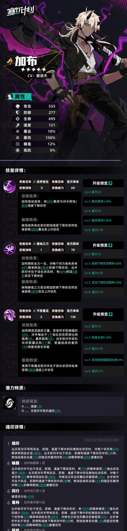 在深海里,没有人的速度比克拉肯还快!高达112点的速度,比不少五星角色的速度还要快,同时附带6%的精准和12%的抵抗能力,弥补了防御较低的缺陷,并且满级魂印附带的75%减伤,大大提高了克拉肯的生存能力。一技能的效果是有百分百的概率让敌方群体共计下降2个回合,二技能的效果就比较优秀,通过自身进入睡眠状态来为己方群体回复克拉肯40%最大生命值的血量,搭配起魂印的高额减伤,能够保证己方群体的生存能力,最后的大招能够让敌方群体有75%的概率无法恢复生命,可以说是一个不错的辅助定位。