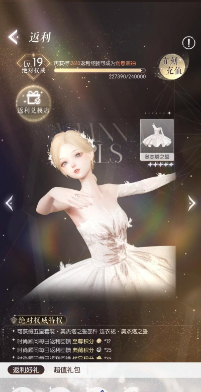 首充就能够解锁的V1,能够获得梅子岁月的戒指部件,并且可以一键购买体力和金币,极大地方便了小伙伴们游戏的过程,还能够获得文字称号“开启新世界”。充值15元到达的V2等级,可以获得耳环部件,以及文字称号“轻盈点缀”,充值50元达到V3,获得文字称号五光十色,同时梅子岁月的套装可以任意选择一套,充值85元达到V4,获得文字称号“视觉艺术”,充值125元达到V5,获得梅子岁月四星部件的连衣裙和文字称号“荧宴派对”,梅子岁月的全部套装就收集完成了。