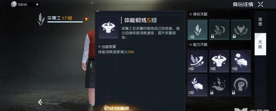 在身份一栏的界面中,主要分为三种类型,分别是采集类、生活类以及制作类,采集类又分为四种,分别是伐木、矿工、采集工和猎人,这四种身份共用采集熟练度,但每日大家可以获取的采集熟练度是有上限的,当然一两天忘记做了问题不大,每周也同样有上限,这就极大程度的方便玩家们提升自己的能力。当然,四种身份也有着升级先后之分建议大家可以先升级采麻工,因为可以大幅度的提升玩家的气力值上限,升到17级之后再去升级剩下的三种身份,能够方便大家平时的跑图等操作。