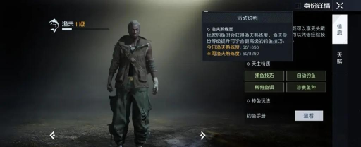 首先给大家介绍一下关于渔夫这个身份,玩家选择渔夫之后在钓鱼方面,会比其他没有选择这个身份的更加天赋异禀,能够钓上来的鱼的种类也就会更多。特别是在渔夫熟练度达到一定等级之后,就会拥有专属的身份技能。