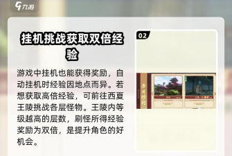 其次就是可以参与挂机,自动挂机的时候也有奖励给大家,不同的地方挂机获取的经验不同,想要获取高倍经验的话,就需要大家去西夏王陵,在王陵里面大家是可以挑战每一层的怪物,等级越高的层数刷怪获取的经验奖励会是双倍的哦。