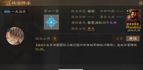 这是需要将典韦分解之后才能获取的战法,典韦本身在肉盾和辅助方面极其出色,也有不俗的武力成长,将其牺牲掉换来的战法自然效果不能太差。作为橙色品质辅助技能,不需要手动释放被动就能生效,所以没有任何冷却时间。开战之后以自身为中心扩展到范围三格以内,所有在其中的敌人都会降低1点移动力,输出也会同步降低,当达到满级时除移动力减少不变之外,输出消减最多能达到16%。