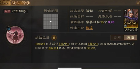 这一战法来自于三国时期猛将张辽,张辽在游戏中自身也是很多流派核心,所以将其分解要一定要下定决心,也要找好能搭配的对象。这一战法属于被动类型,是所有技能中最省心一类。效果是自身获得必中状态,必中并不是每次攻击不会丢失,而是不能被对方援护抵消掉。援护是很多辅助武将能添加的状态,例如曹仁、典韦等,释放援护后所有队友都能获得一次抵消伤害的状态。而拥有万军取将战法之后,就可以无视对方身上的援护。