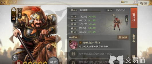 该战法自身属于橙色品质,而且是操作性最好的主动类型,使用之后要经过一回合冷却才能再次释放。要想获得需要先得到文丑,之后再将其分解掉,在传承功能里消耗其他15张紫色卡牌就能得到。好在文丑本身出场率并不高,所以拿到之后直接分解也不会带来太大影响。效果是在使用之后对周围两格范围内敌人造成群体伤害,满级时计算比例为120%。如果选择位置足够好,武将本身武力值又高,最终伤害很可观。