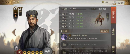 这个战法其实来自于群雄区域的田丰,他是一个防御六星的角色。属性面板上更为突出的则是智力以及政治、统帅值,再加上他的兵种是骑兵。所以一眼就能看出他是一个谋略型的武将,主打的还是谋略伤害。
