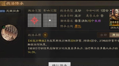 他的可继承技能是风雨同舟,也就是这期大家想知道的技能。这是一个S等级的战法,用了之后能够为队友承担高达百分之五十的伤害,另外结束回合后还可以恢复自身的兵力,适合给主C挡刀。