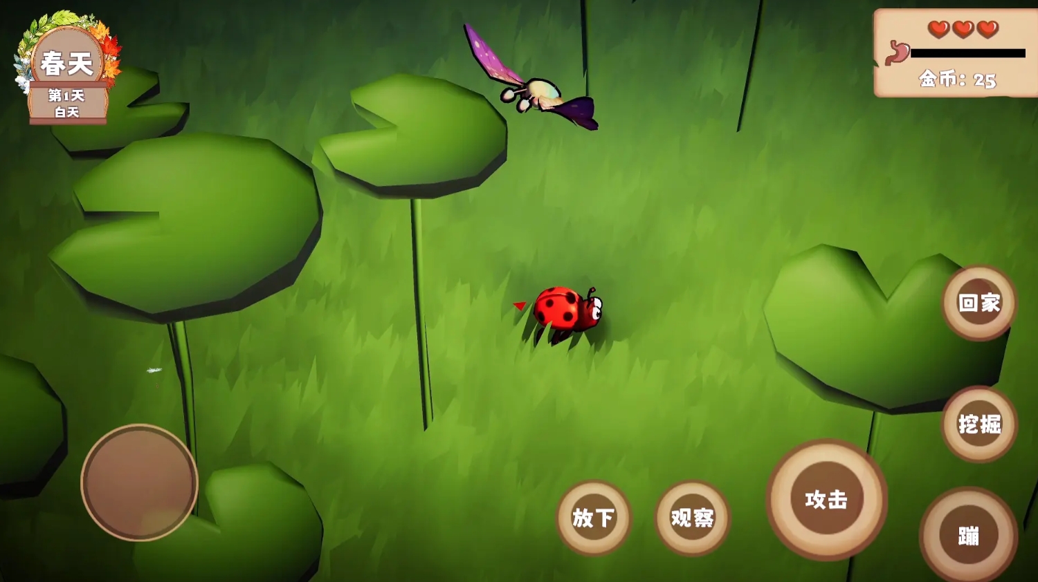 一款以瓢虫为主角的生存模拟游戏,设定为连续12天的微观生存挑战。白天需主动搜寻蚜虫等食物源并规避鸟类、蜘蛛等天敌;夜晚则转入巢穴防御阶段,抵御入侵的甲虫、蜈蚣等夜行掠食者。动作系统强调物理反馈与操作精度,移动、跳跃、喷射防御液等行为均贴合瓢虫真实习性,探索区域开放且无固定路线,鼓励玩家自主规划每日行动逻辑。