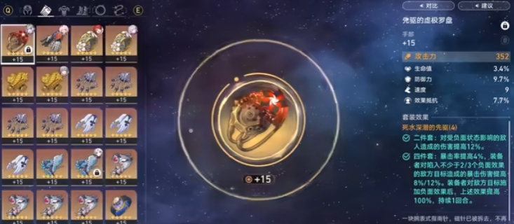 套装效果对于赛飞儿来说有最好,没有问题也不大,最重要是将速度堆到一百七以上,因此选择二速度加二速度或二速度加散件,又或者选速度副词套很高的四散件都是可以的。衣服选暴伤衣,鞋子带速度鞋,球带量子属性伤害,绳子带充能,有很高速度副词条的衣服和球时也可以不追求主词条。副词条中优先级最高的是速度,保证一百七速度是赛飞儿的核心,在这基础上暴击暴伤大于攻击力大于效果命中。