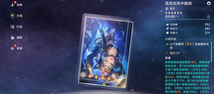 赛飞儿的光锥首选谎言在风中飘荡,这个光锥算是决心如汗珠般闪耀的加强版,提供的速度加成完美契合赛飞儿的机制,能大大降低培养她的难度,百分之一百二基础概率的减防效果也能让她每回合稳定上debuff,加入黄泉队伍时保证了给黄泉的叠层效率。该光锥的通用性还是很高的,除了赛飞儿像银狼和佩拉这种虚无辅助也都能携带,但如果想吃满的话养成难度会比赛飞儿高一些。