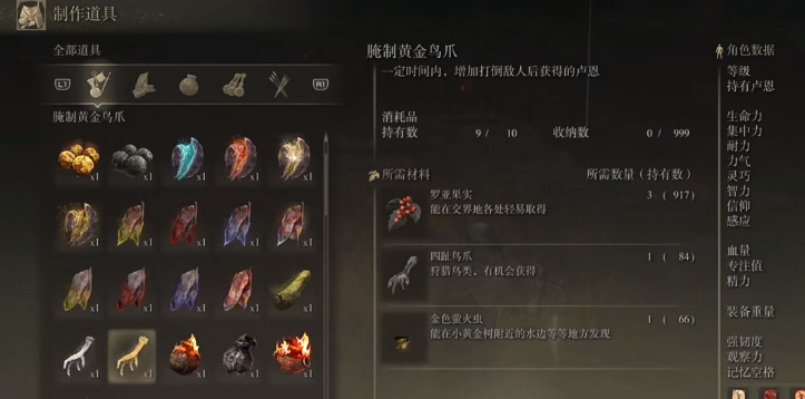 如果玩家在艾雷教堂购买了制作前置物品,就能在进行物品的制作,所需材料有着四趾鸟爪以及金色萤火虫。四趾鸟爪的刷取需要来到不破大桥赐福点,在崖边就会刷新三只鸟类击杀后即可掉落,坐下附近的赐福点即可重复刷取。金色萤火虫需要来到雾林边缘赐福点,在森林里的一处池塘就可以拾取大量金色萤火虫,同样坐下赐福点就可以重复拾取。