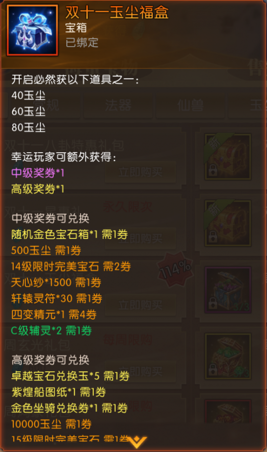 参与方式:天涯海市限时上架八卦/仙古/玄鹿三大特惠礼包与“玉尘福盒”