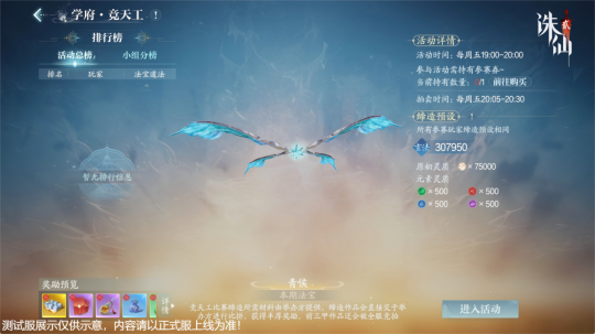 在此,系统将免费提供所有缔造材料,所有玩家使用统一的默认模板,全心比拼对炼宝之道的领悟。每人拥有两次机会,最终以法宝蕴含的道法”论高低,仙友们仅需购买门票即可参与活动。