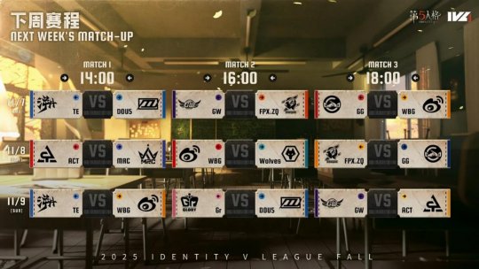 新一轮的较量已经开启,面对曾经交战的对手,谁能扳回一城,谁能继续保持绰约风采?北京WBG战队三场硬仗蓄势待发,将与积分榜上的劲敌逐一过招,越是势均力敌的交锋,越考验战术博弈,他们能否在连环对决中稳住阵脚?敬请锁定11月7日14:00第五人格赛事直播间,让我们一起期待选手们的精彩表现!