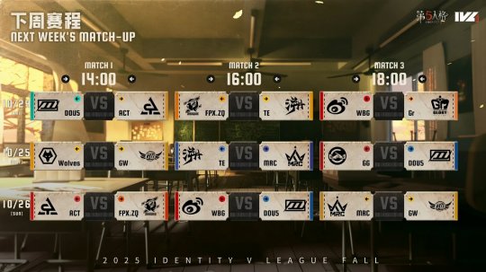 本周MRC战队获得七连胜在积分榜上拔得头筹,Gr战队紧随其后不遑多让,成都GG战队排名更进一步。赛程将半,战况升级,敬请锁定10月24日14:00第五人格赛事直播间,我们一同见证选手们的精彩表现!