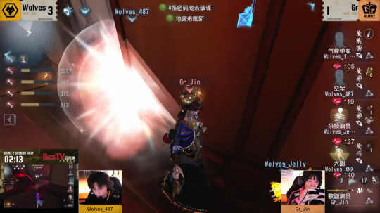 第三天,成都Wolves vs Gr第二局下半场,Gr_Jin再次展现追击流监管者的暴力美学,开局Gr_Jin进入鬼屋准备追击Wolves _Jelly杂技演员,极速影跃贴近身位,在杂技演员跳跃一瞬间出刀,开局14秒便成功拿到第一刀伤害,杂技演员欲进入长板牵制,但Gr_Jin不断压制身位不让其贴近板子有博弈空间,开局24秒便击倒杂技演员并挂往地下室,打破本赛季最快击倒记录。Gr_Jin已知大副前来救人的方向,提前出击,将Wolves _XMX在还未进入鬼屋时便将其海神怀表第一段逼出,面对这个易守难攻的地下室,Wolves _XMX顶住压力灵活走位,在狭窄地形也能规避监管者出刀,成功进入地下室极限将人救下。但因杂技演员在化险为夷期间绕路走位浪费太多时间,导致不能及时拉离并再次被挂回地下室,Wolves _487空军前来二次救援,Gr_Jin利用出刀的前后摇僵直故意卖出破绽,引诱对方开枪并成功后撤步躲避,且Wolves _487博弈时间太久,没有注意淘汰进度,最终未能进入地下室并被打下状态,被Gr_Jin闪现落地击倒。再一次的地下室上挂使求生者整个局势积重难返,进入慢性死亡。但值得一提的是,Wolves _tian在后期展现出了稳健的牵制能力,交道具的时机恰如其分,板间博弈干净利落,面对二阶歌剧演员成功牵制70秒,实在是后生可畏。通过本局的交战,Gr_Jin也成为本赛季首位淘汰人数达50次的选手,恭喜Gr_Jin!
