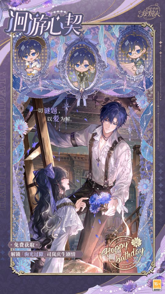 10月13日09:30 - 10月22日05:00,参与司岚生日活动「驹光过隙」,在生日当天与他共度,完成剧情即可免费获得1张生日纪念画灵[洄游心契]。