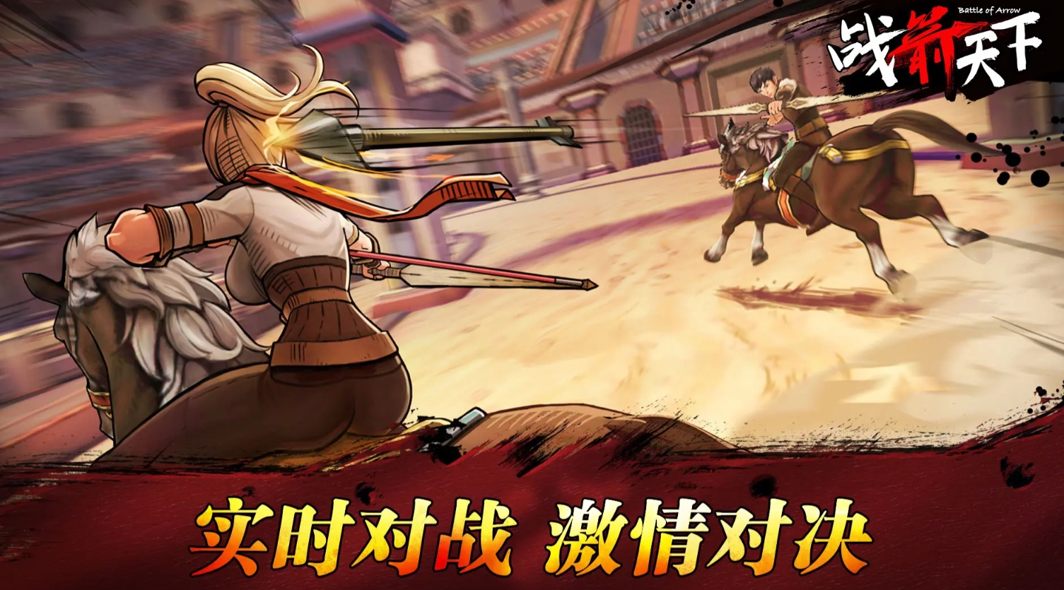 以古代骑射对决为背景的实时PVP竞技游戏。玩家操控骑手在环形战场中高速迂回,通过长按蓄力调节弓箭射程与威力,松手瞬间发射。准星需手动拖拽锁定目标,命中精度受移动速度、风向提示及对手格挡动作影响。若在蓄力过程中被敌方箭矢击中,将强制中断施法并产生短暂僵直。胜利条件明确:率先将对手击落马背者胜,生命值归零即判负。