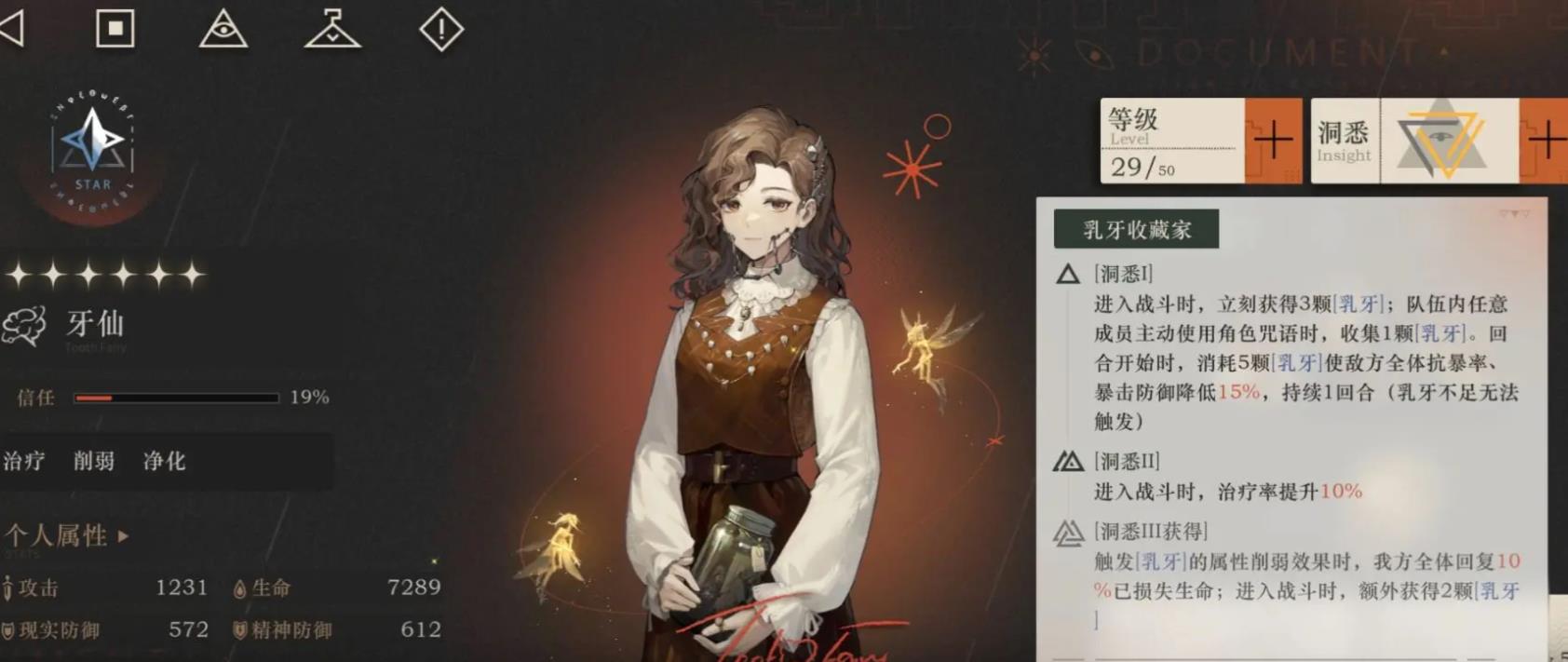 牙仙每过两至三个回合不占用任何行动数便能打出一张治疗牌,治疗量是根据我方角色已损失血量按照百分比计算的,因此她通常用于维持队伍的血线。如果压力实战过大来不及治疗的话,可以考虑让其搭配护盾或者减伤类型的角色来提高生存。尽管她在一些功能上与维拉、6等角色方面存在着交叉,但是仍然有些差别。例如6主打的是即时解控,但是如果敌人给我方的减益状态太多,6单靠自己其实是清不完的。