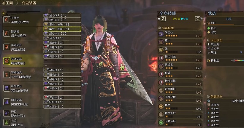 不过这一套的会心只能拉到75%,必须要搭配蚀攻衣装使用。选择二白炽加二黑蚀的校服依旧是最优选择之一,这套使用7攻1匠的机械武器,或者白石龙大剑的时候,在触发挑战者之后是97%的回心率。如果接受不了3%的不暴击可能性的话,武器上再多找一条回心率即可。日常狩猎一些小动物,没办法稳定触发力解的话,这一套肯定是必备的。